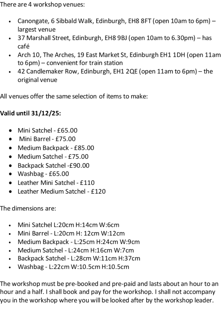 Subject to availability of places, at the end of your walking tour for the creative ‘young at heart’ there is a unique opportunity to join a workshop and make your own Harris Tweed handbag, a lasting memento of your visit to Edinburgh This is not suitable for young children.
